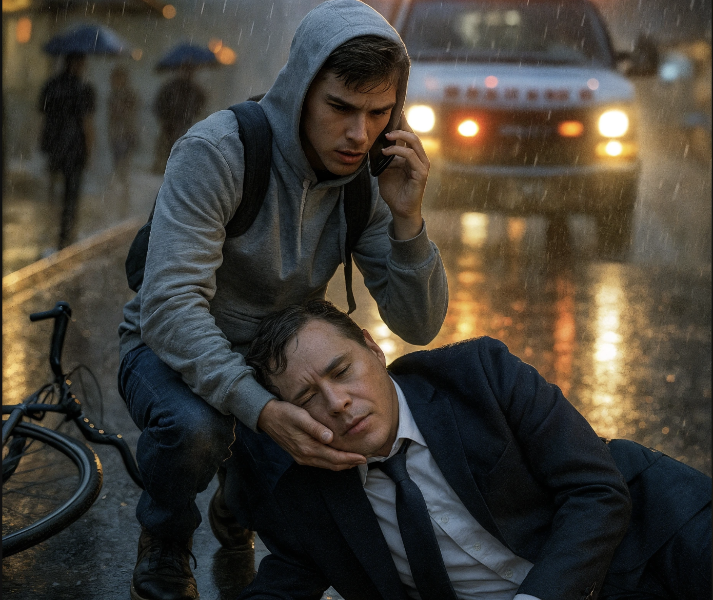 Κοντά σε μια στάση λεωφορείου, ένας άνδρας ντυμένος με μπλε κοστούμι βρισκόταν αναίσθητος, ξαπλωμένος με το πρόσωπο στραμμένο προς το πεζοδρόμιο. Οι βιαστικοί περαστικοί τον κοίταζαν ελαφρώς, αλλά συνέχιζαν τη διαδρομή τους. Ο Ethan επιβράδυνε—μόνο για μια ανάσα—με την εξέταση και το μέλλον του να ζυγίζουν βαριά στο μυαλό του. Η συνείδησή του του απαγόρευσε να αγνοήσει την κατάσταση.