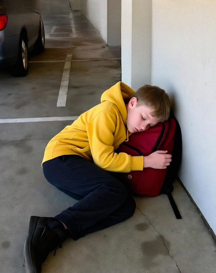 Πλησίασα προσεκτικά, τα βήματα μου ηχούσαν στον άδειο γκαράζ. Καθώς πλησίαζα, περισσότερες λεπτομέρειες έγιναν ορατές: ένα φθαρμένο παλτό τυλιγμένο σφιχτά γύρω του, ένα ζευγάρι αθλητικά παπούτσια που αναγνώρισα, ένα γνωστό προφίλ.